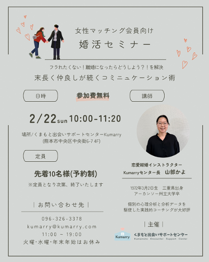 ■場所:くまもと出会いサポートセンターKumarry(熊本市中央区中央街6-7 東洋銀座ビル4F)