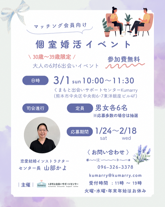 くまもと出会いサポートセンターKumarryでは、より多くの出会いを提供するため、定期的にマッチング会員様限定の「個室婚活イベント」を開催しております。