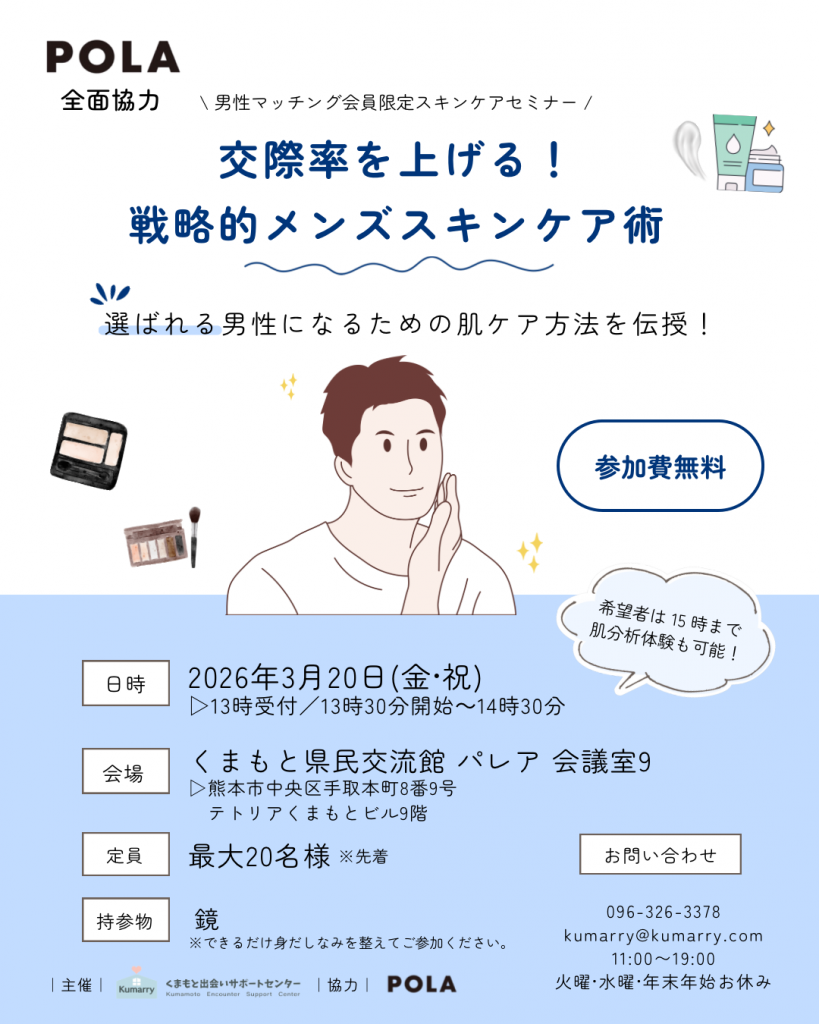 この度、マッチング会員様限定で、株式会社ポーラ様の全面協力のもと、くまもと出会いサポートセンターKumarry主催の男性向けスキンケアセミナーを開催いたします。
