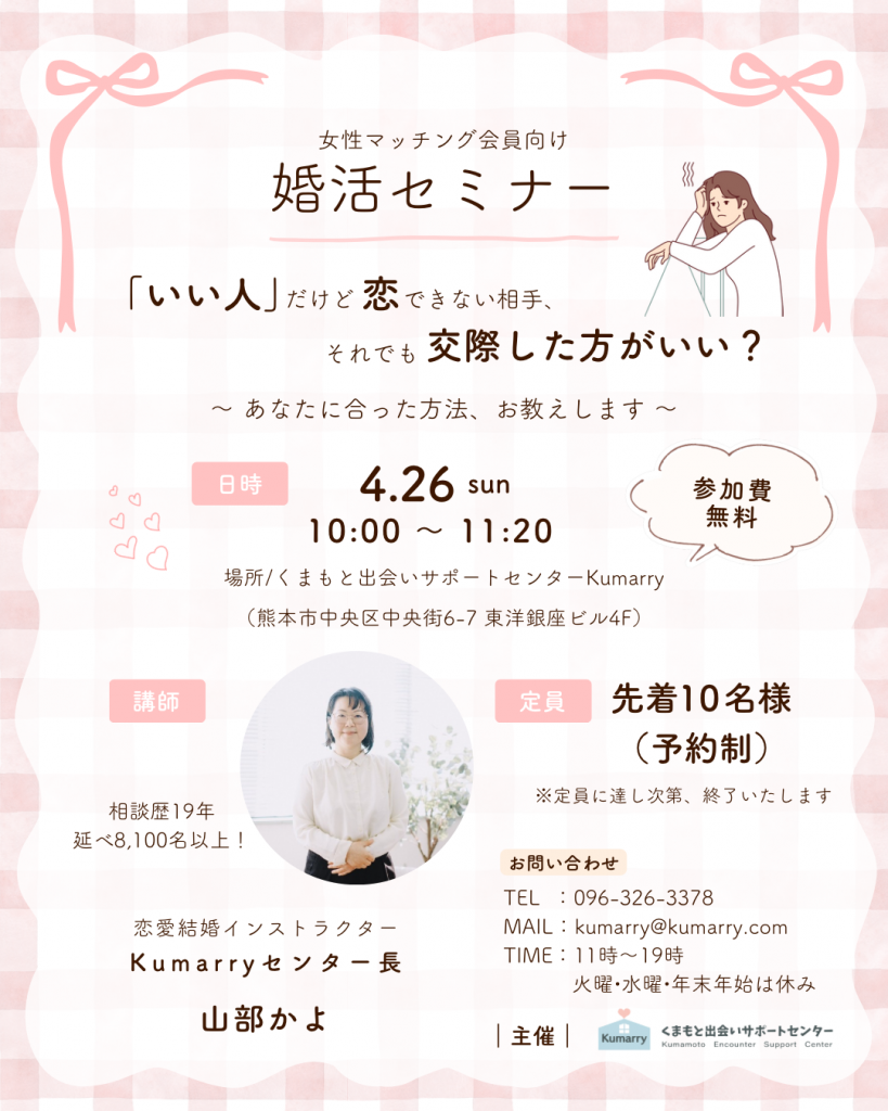 ■場所:くまもと出会いサポートセンターKumarry(熊本市中央区中央街6-7 東洋銀座ビル4F)